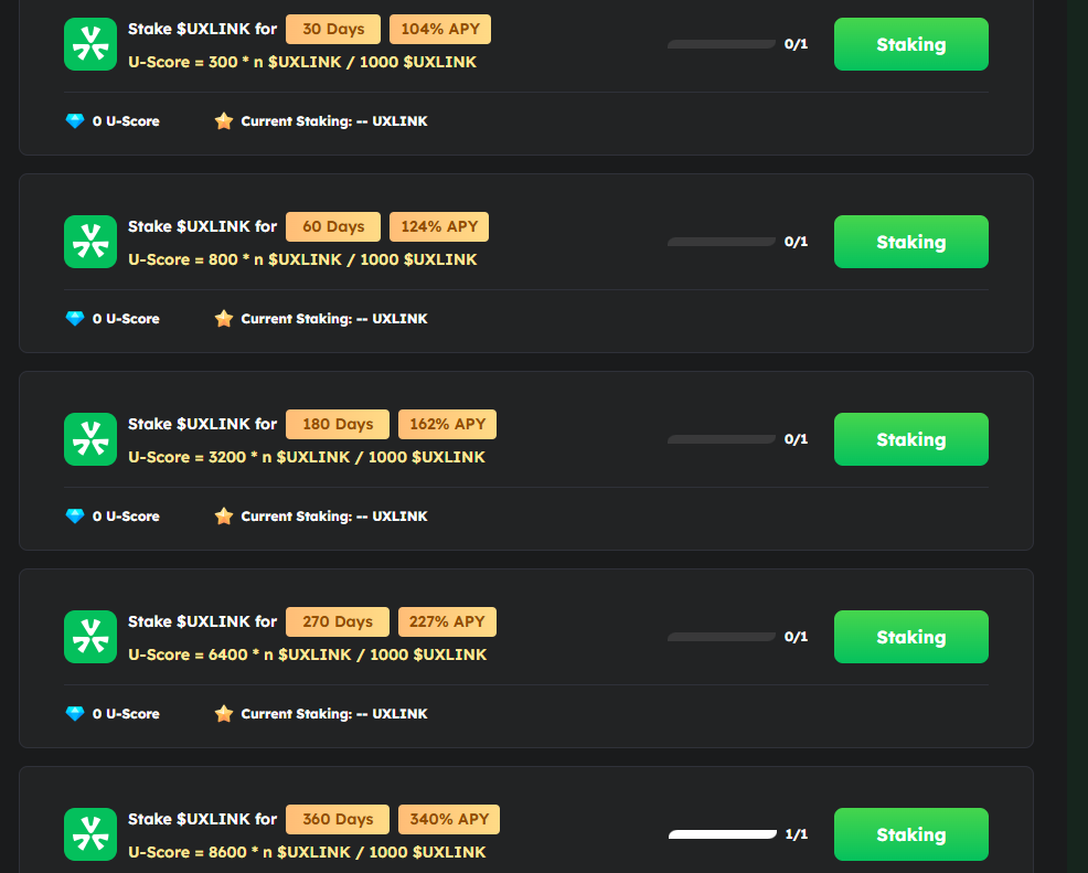 ▶ UXLINK 스테이킹: 이 역시도 본인은 소량으로 360일 예치 박아버림. 소액이 아니라면 절대 비추천입니다.
