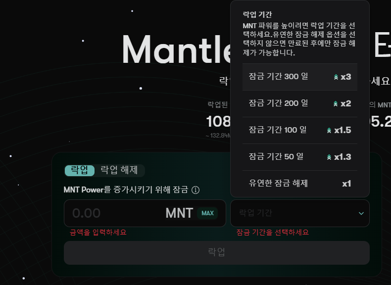 ▶ 아래와 같이 락업 기간에 따라 보너스 파워가 붙음. 하지만 기간이 길어지면 맨틀 코인 하락시 자산 손실이 있으므로 주의해야함.
