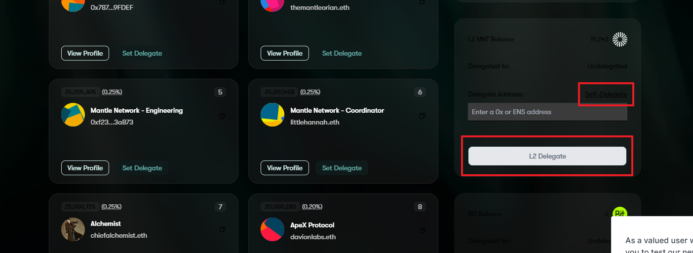 | 1. 체인리스트에서 맨틀 네트워크 추가 -> 소량의 $MNT 소지(50개정도?!) 2. Delgatevote 사이트 이동 -> Self-delegate 클릭 -> L2 Delegate 클릭 -> 컨펌 3. 공식홈에 들어가 SBT 민팅 및 프로필 작업 -> 하위 댑 (퓨전X 및 ang파이낸스에서 스왑 및 유동성 트젝남기기) 4. 질리 미션 |