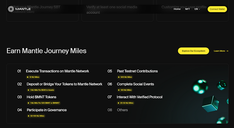 드디어 맨틀 네트워크가 테스트넷을 끝내고 메인넷을 출시하였습니다. 현재 맨틀코인($MNT)는 여러 거래소에 상장되어 있습니다. 그럼 맨틀 코인을 얻기위한 에어드랍은 어떻게 준비해야 할까? 맨틀 네트워크에서는 자신의 체인에서 다양한 활동들을 한 유저에게 마일(Mile)을 제공하고 있습니다. 이 마일에 따라 에어드랍 양이 정해진다고 하니 따복따복 모아보시기 바랍니다.