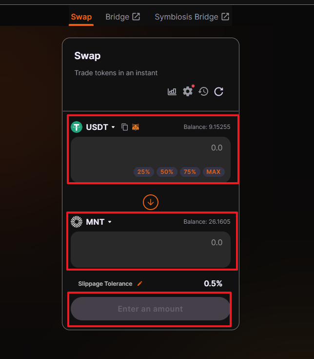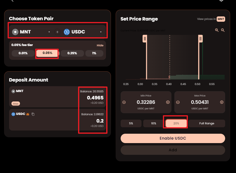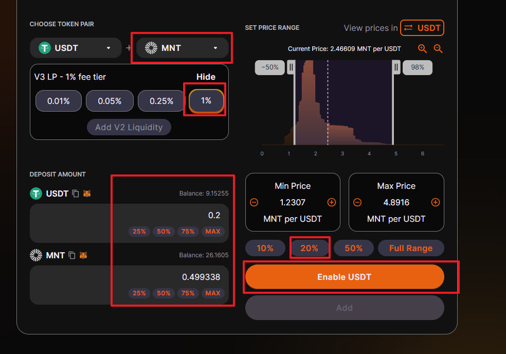이제 유동성을 제공해 봅시다. 상당의 Lauidity 를 클릭하면 다양한 풀들이 나올겁니다. 그 중 USDT-MNT를 선택하여 유동성을 넣보도록 합니다.