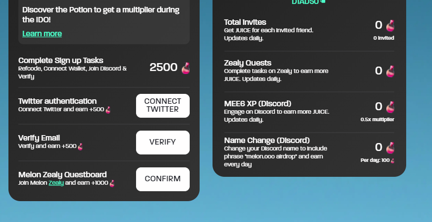 그 외 미션들을 완료하면 많은 포인트들을 획득 할 수 있으니 해보시기 바랍니다. 이 쥬스 포인트가 멜론 코인 에어드랍의 양을 결정하게 됩니다.