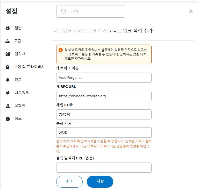 ● 메타마스크에 Wod Forgenet 네트워크 추가하기
