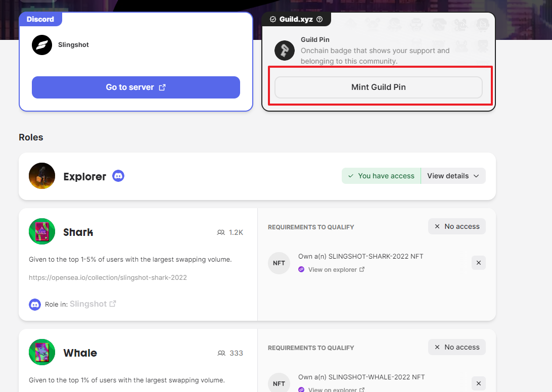 4. 길드에서 길드 핀 발행 및 마켓에서 필요한 NFT 구입후 롤 얻