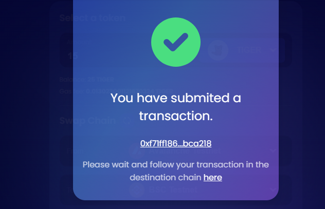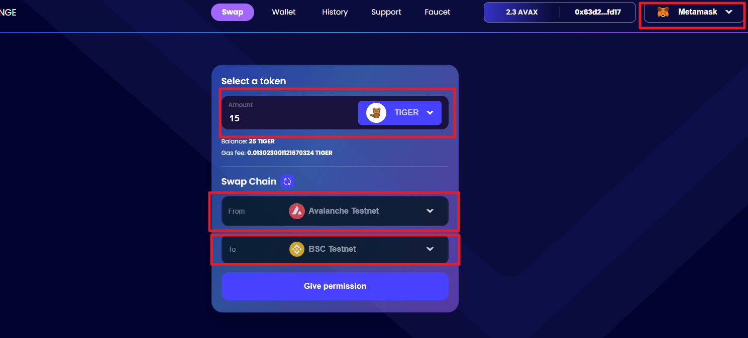 1) 지갑 연결 후, 타이거토큰 선택, 아발란체 체인 선택, 바이낸스스마트체인 선택 후 Give permission 클릭!! 그리고 'Swap'