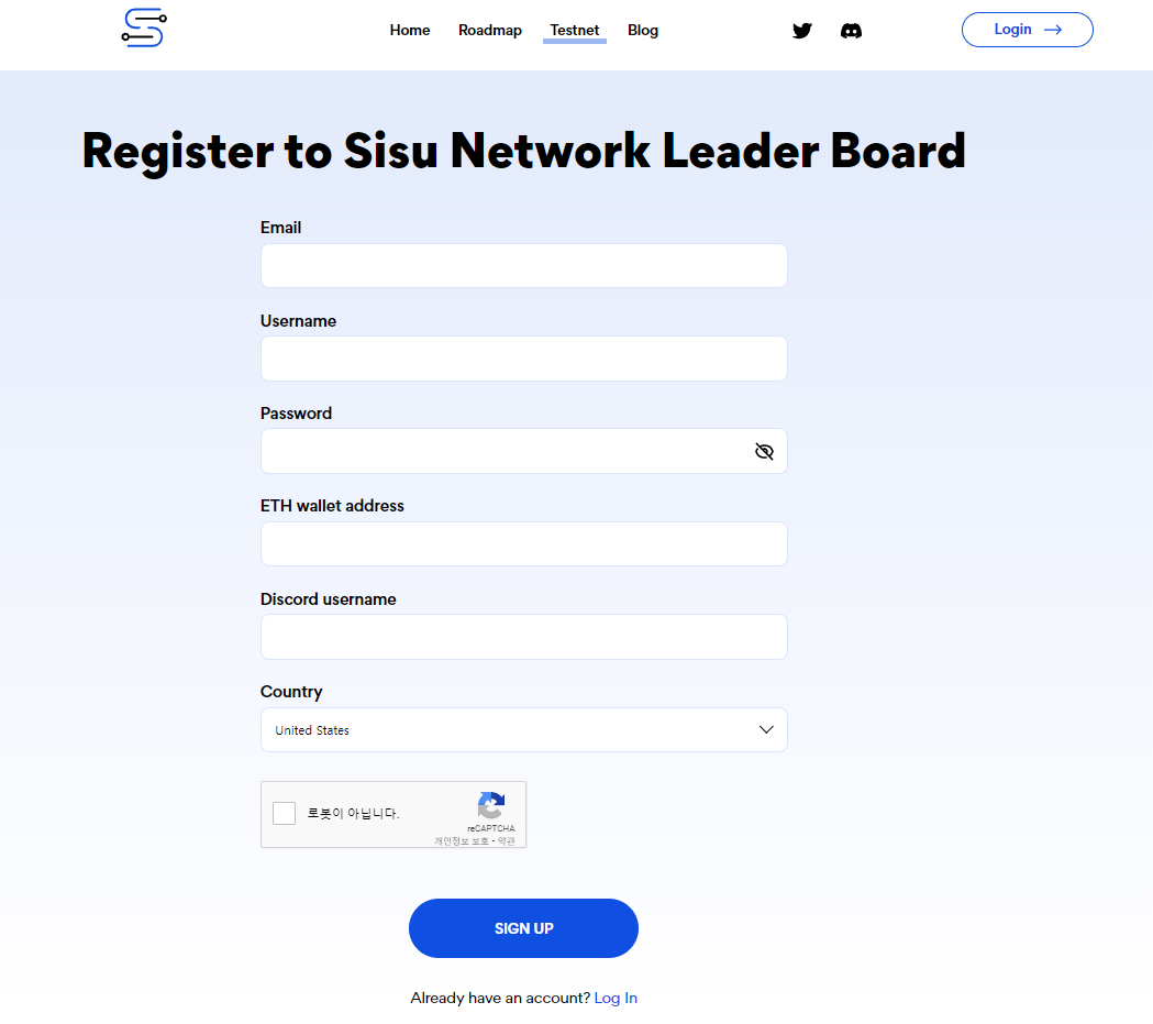 - 이메일, 이름, 비밀번호, 지갑주소 등을 입력한 후 SIgn up 을 클릭 테스트넷 참가를 등록합니다.