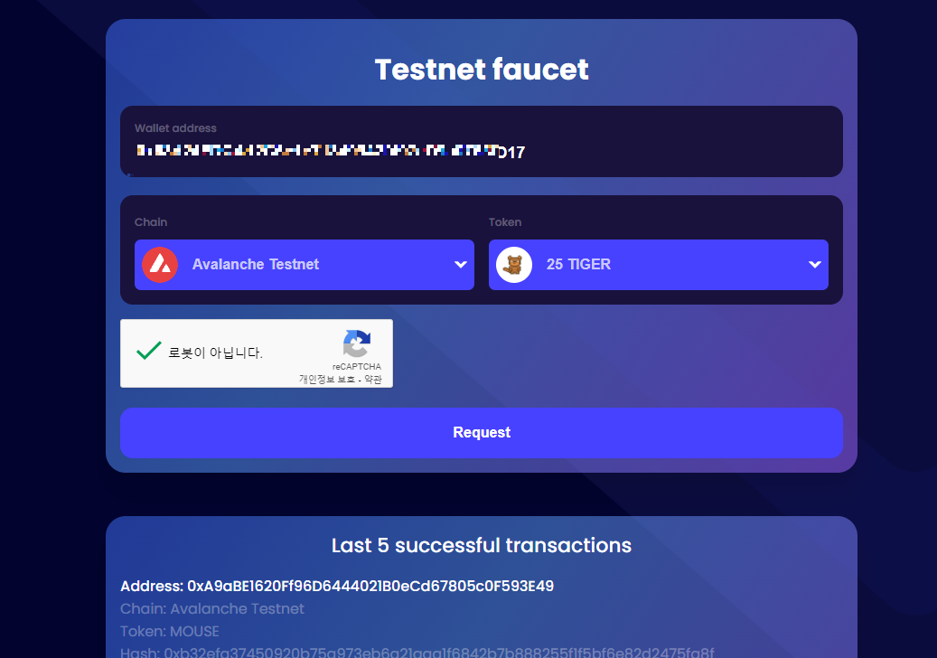 아래의 화면과 같이 지갑주소, 아발란체 체인 선택, 타이거 토큰 선택, 캡챠 체크한 후 리퀘스트 클릭!