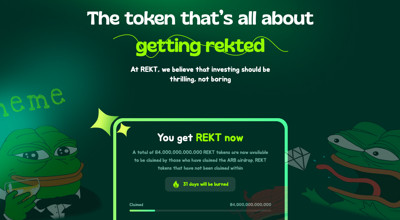 얼마전 아비트럼 에어드랍대상자들에게 아비도지AI라는 밈코인 에어드랍이 있었습니다. 이는 대 히트를 쳤고 이 붐을 이어 이번엔 REKT 밈코인을 에어드랍해주고 있습니다. 현재 멕스 거래소에 상장되었고 역시나 쭉쭉 떡상중이네요. 아비트럼 에어드랍을 받으신 분들은 REKT도 놓치지 말고 에어드랍받으시기 바랍니다.
