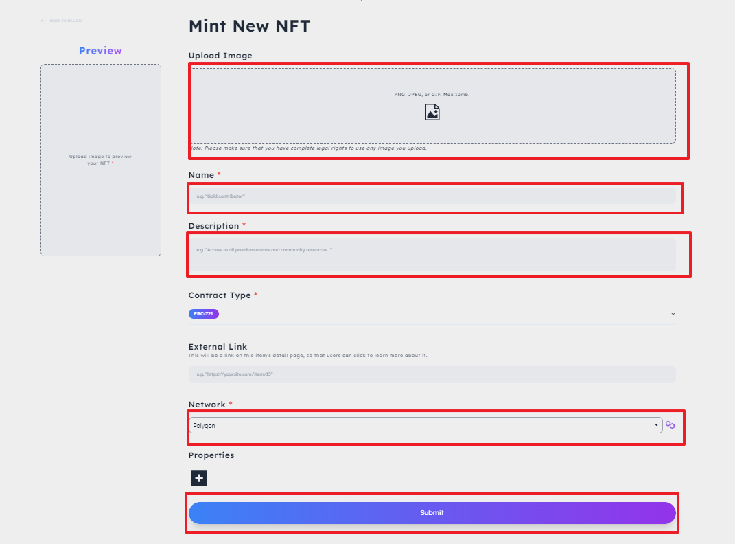 1. upload Image: 아무 이미지나 업로드 2. Name: 대충 이름 넣기 3. Description: 대충 아무말 넣기 4. Network: 클릭하여 Omni Testnet 으로 선택! 5. Submit 클릭! 완료! |