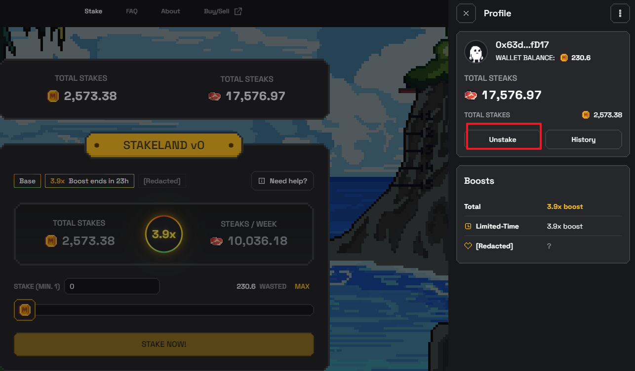 그래도 다행이 에어드랍까지는 주네요. 현재 밈코인은 자동 스테이킹되어 있는 상태입니다. 여기서 코인을 자신의 지갑으로 옮기고 싶다면 아래와 같이 자신의 지갑 클릭! 언스 진행해주시면 됩니다.