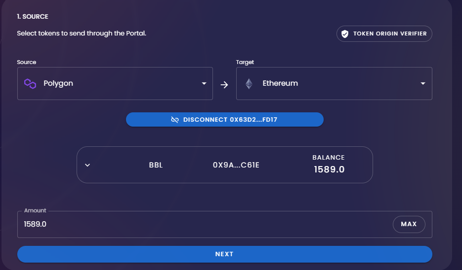 - 'select a token' 에서 비블 컨트랙 입력 - 브릿징 수량 입력 - Next 클릭!