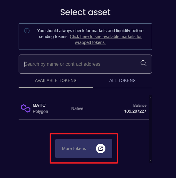 - 아래와 같이 폴리곤 체인 선택 후 Asset 클릭! - 하단의 More tokens 클릭하면 새로운 화면으로 넘어감.