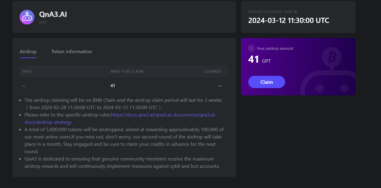 QnA3 클레임 사이트: https://qna3.ai/airdrop