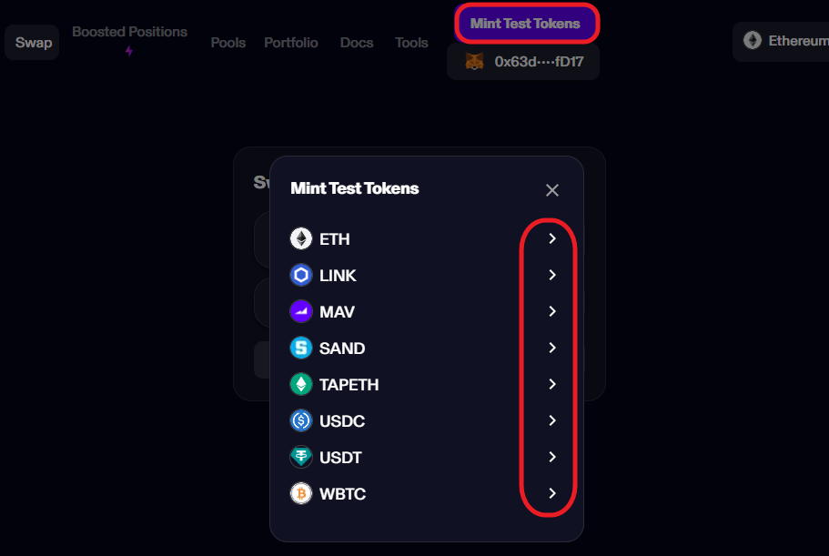- 사이트 이동 후 지갑을 연결하시고 지갑주소 왼쪽에 잇는 'Mint Test Tokens'를 클릭!!
