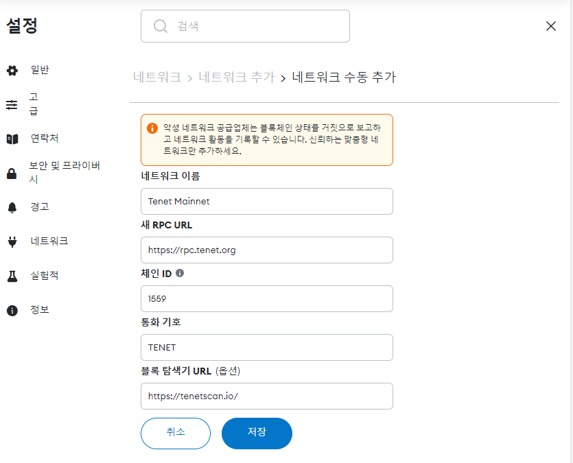 메타마스크에서 네트워크 수동 추가를 선택하여 아래와 같이 입력하여 네트워크를 추가해줍니다.