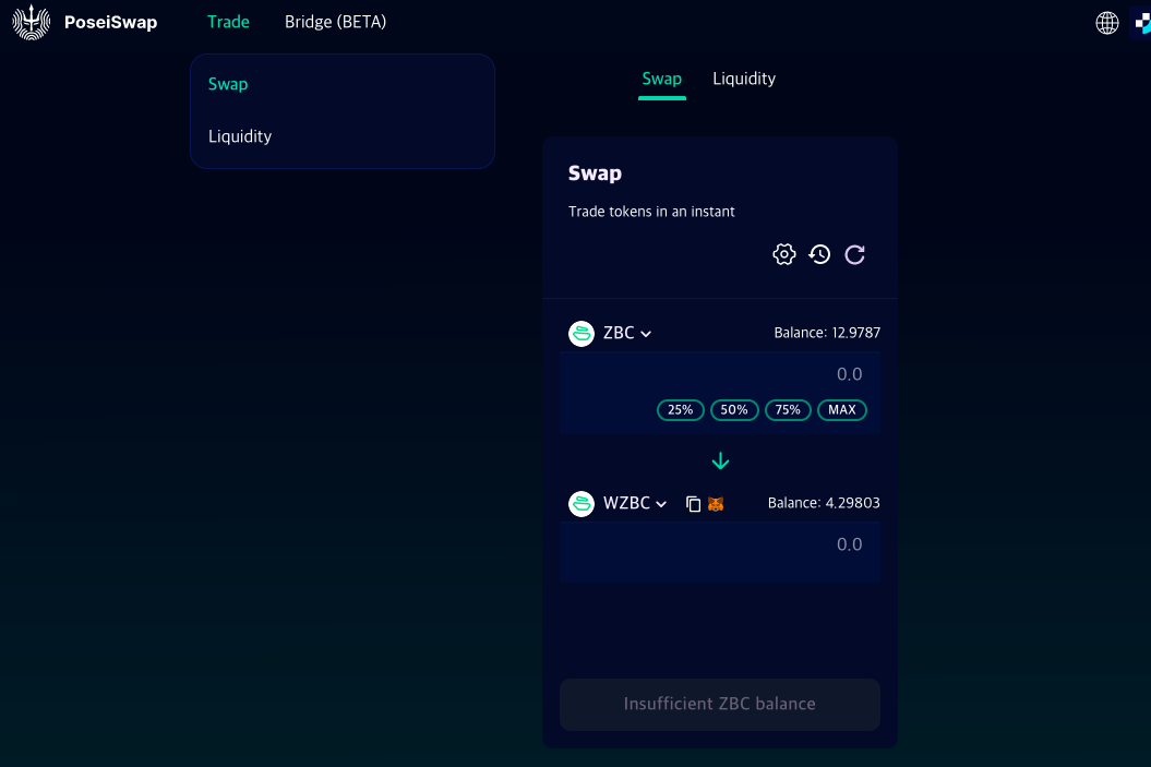 모든 토큰을 받으셨다면 이제 포세이 스왑에서 다양한 토큰들을 스왑해 봅니다. 위쪽 Trade탭에서 Swap을 클릭하면 아래와 같은 화면이 나옵니다. 그럼 받은 토큰들을 다양하게 스왑해 봅니다.