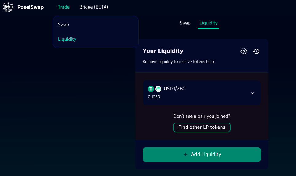 이제 Trade탭에서 Liquidity를 클릭하여 유동성을 제공 및 제거해 봅니다.