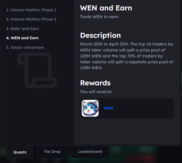 - $WEN 거래 이벤트도 함께 진행중이므로 거래소에서 $wen 으로 거래량을 채운다면 더블 파밍 가능($wen 이벤트는 4월 15일까지)