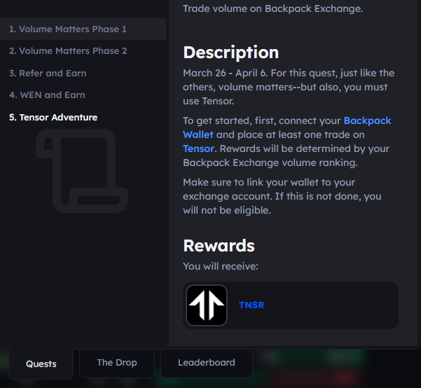 - 보상은 $TNSR 토큰, 백팩 거래소 불륨 랭킹에 따른 보상
