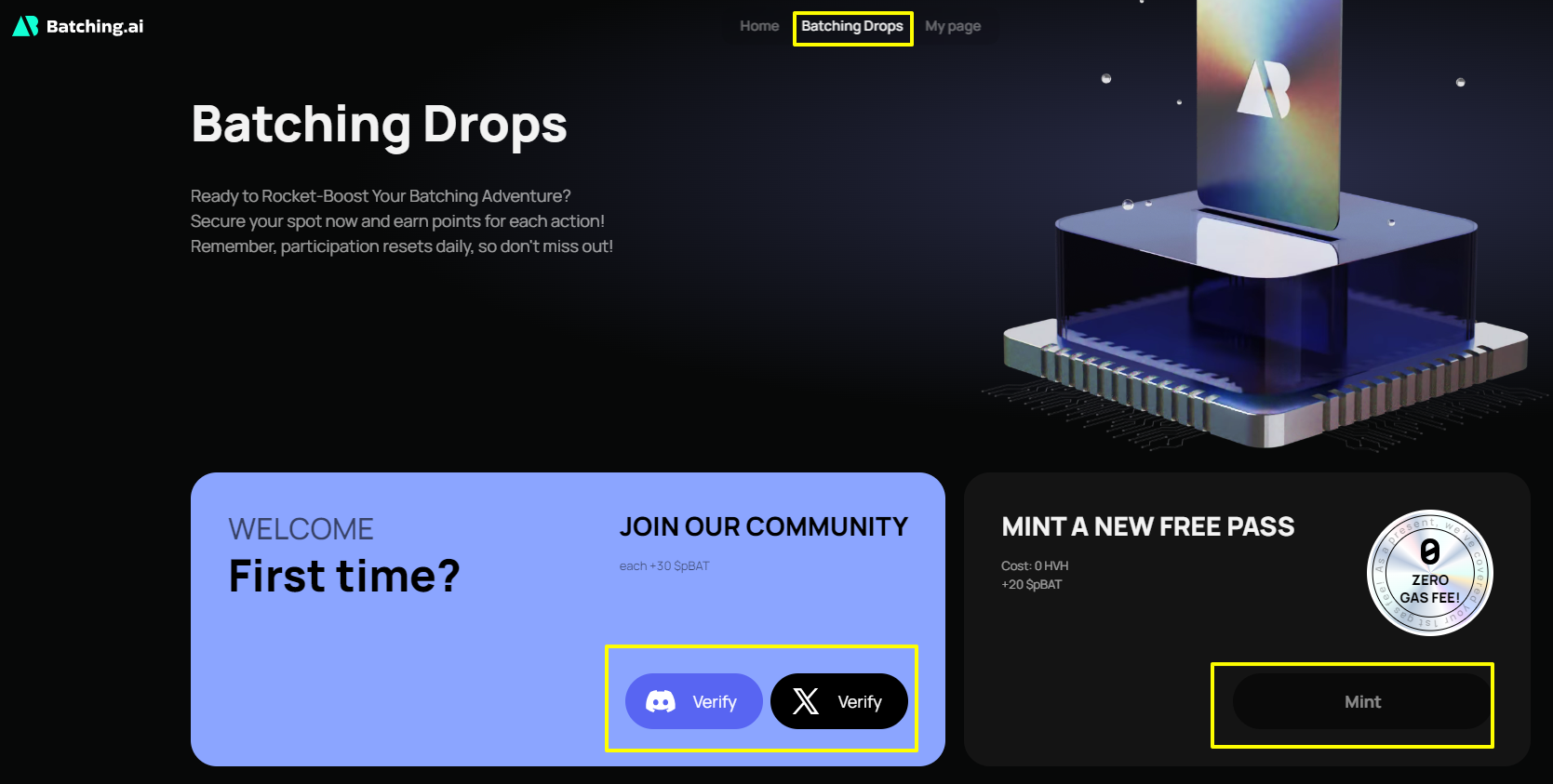 - Batching Drop 클릭! // 커뮤니티 가입(+60pBAT) // 프리민팅 진행