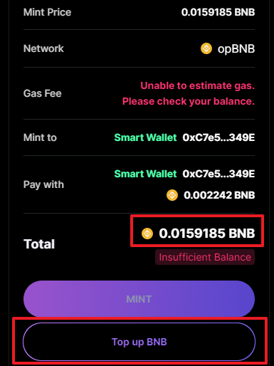 ▶ Free CARV 를 클릭! → Top up BNB를 클릭하면 나오는 지갑주소에 해당 민팅비 전송 → MNT 활성화 되면 민팅