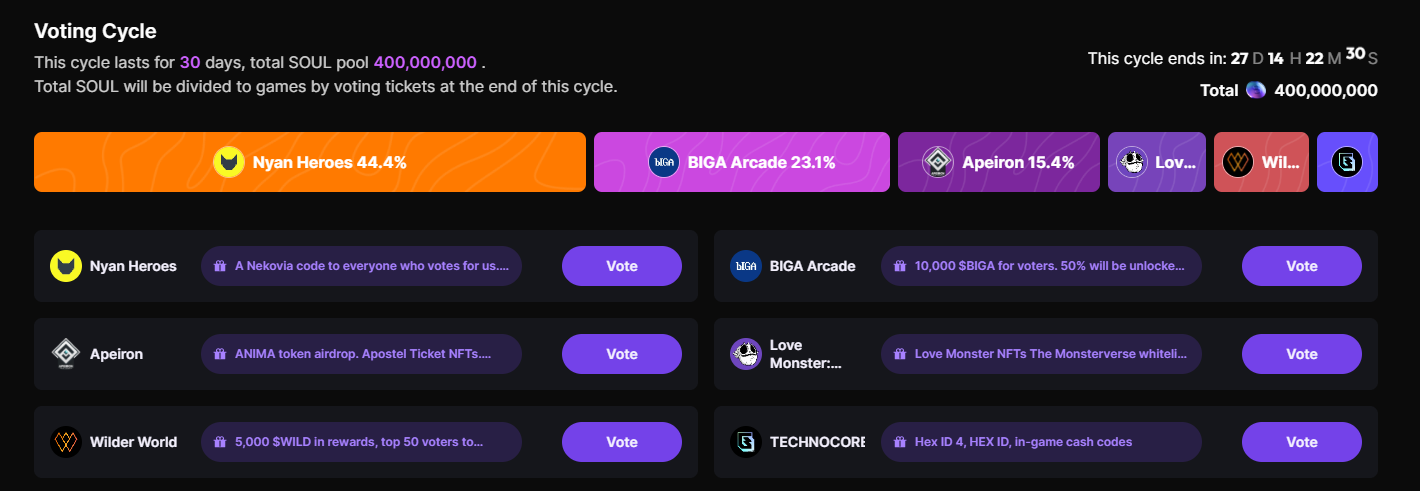 - 스테이킹을 통해 얻은 투표권으로 6가지 게임 프로젝트에 투표를 할 수 있음.