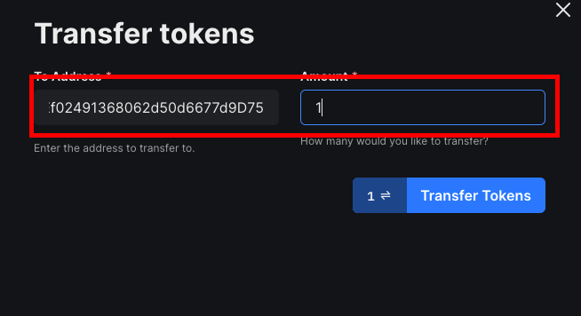 그럼 아래와 같이 우리가 보내야할 리네아 측 지갑주소를 입력한 후 토큰 한개를 선택후 Transfer Tokens를 클릭합니다.