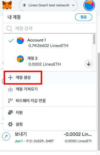 아래의 사진에서 오른쪽 위 동그라미를 클릭하면 아래와 같은 메뉴가 나옵니다. 계정생성을 클릭하여 부지갑을 생성할 수 있습니다. 생성된 지갑의 주소로 이더리움을 보내주면 됩니다.