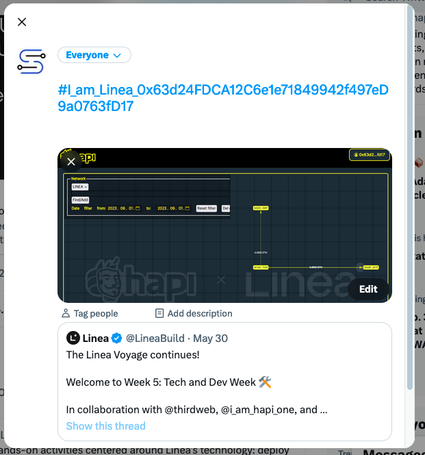 위의 트윗으로 이동 후 트윗 인용을 클릭(Quote tweet) -> #I_am_Linea_자기메타마스크주소 를 입력 후 스샷을 함께 첨부하여 올립니다. 아래와 같이 올리면 Hapi 미션 끝.!!