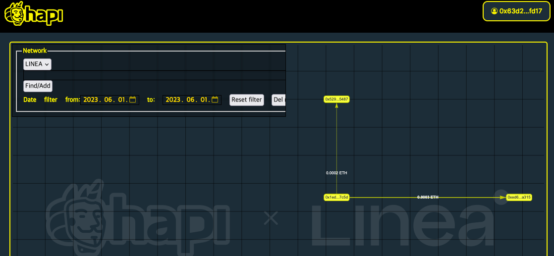 1) hapi 사이트 이동 지갑연결.!! -> 아래 filter에서 리니아보내기 트잭을 남긴 기간이 포함되도록 기간 설정 -> Find/Add를 클릭하면 자신이 남기 트잭이 두번째 사진처럼 화면에 뽀로롱 뜰겁니다.