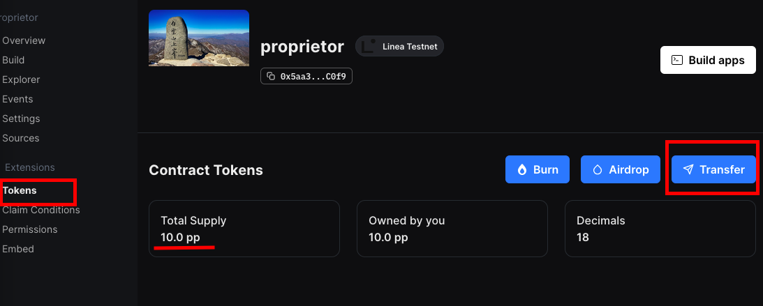 민팅이 완료되었다면 왼쪽메뉴에서 Tokens를 클릭! 민팅한 토큰 10개가 들어왔다면 Transferf를 클릭합니다.