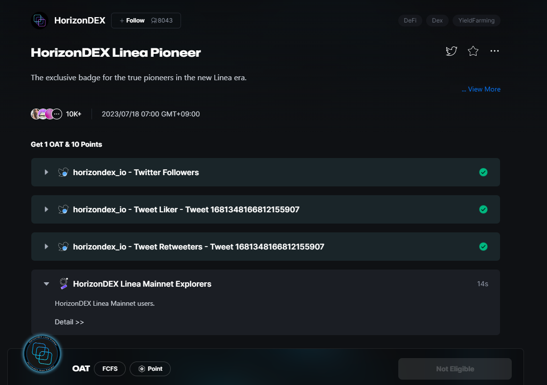 아주 간단합니다. 호리즌 트위터 팔로우, 해당 트윗 좋아요 및 리트윗, 호리즌덱스를 이용하면 OAT 획득 가능합니다.
