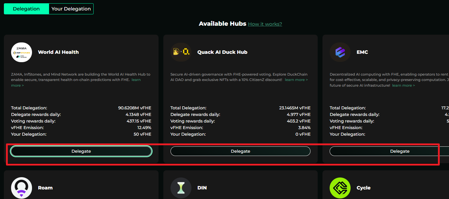 : 초대코드 입력으로 받은 20vFHE로 위임 진행 후 더 받은 30을 더해 총 50 vFHE 위임가능