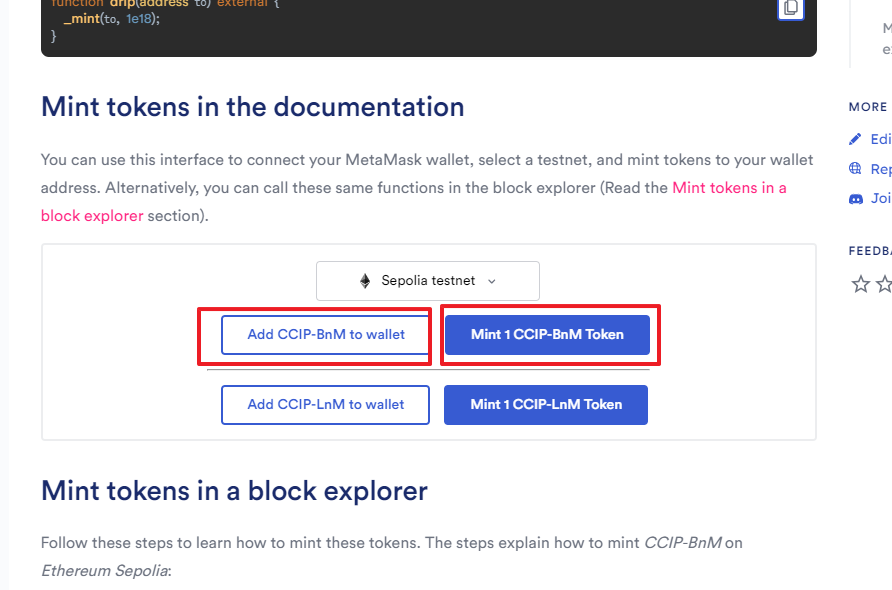 - Sepolia testnet 의 차례로 클릭하여 CCIP-BnM 토큰 민트하기