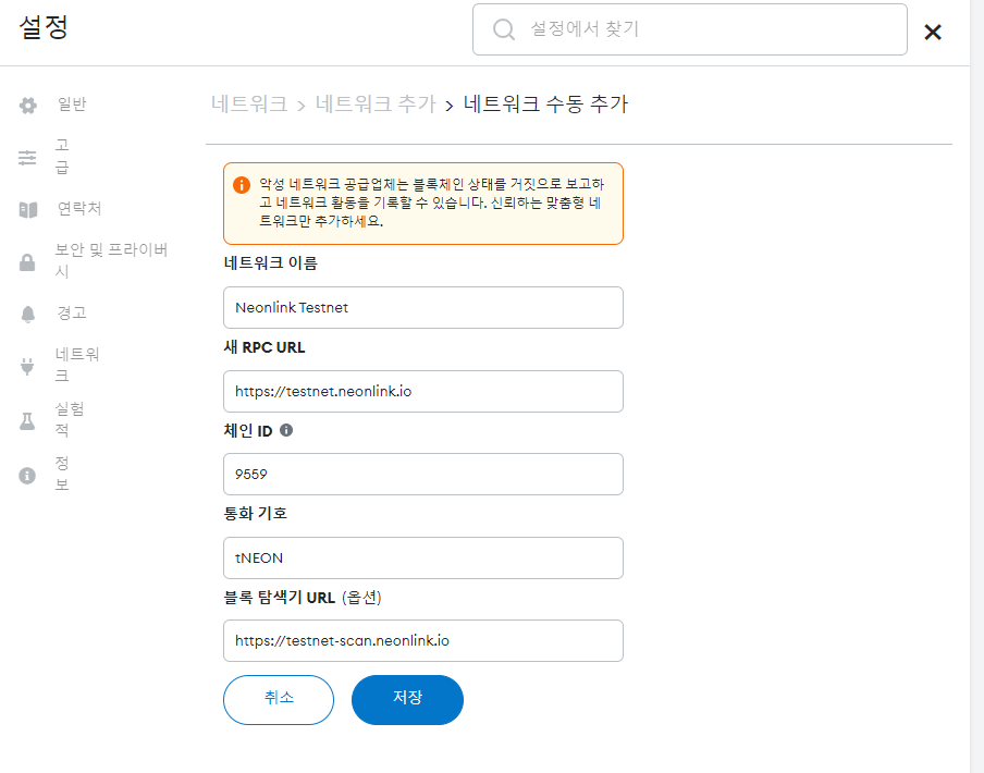 가. 메타마스크에 네온테스트넷 추가하기
