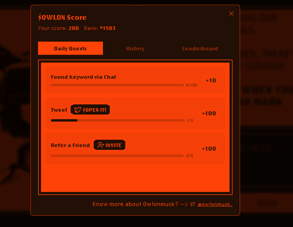 - 하단의 $OWLON 버튼을 클릭하면 데일리 퀘스트 및 순위 등을 확인할 수 있음
