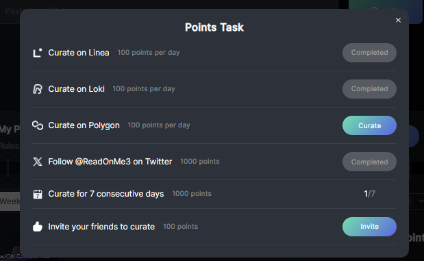 - Get points 클릭 후 미션 완료(Linea, Loki, polygon 체인 큐레이트)
