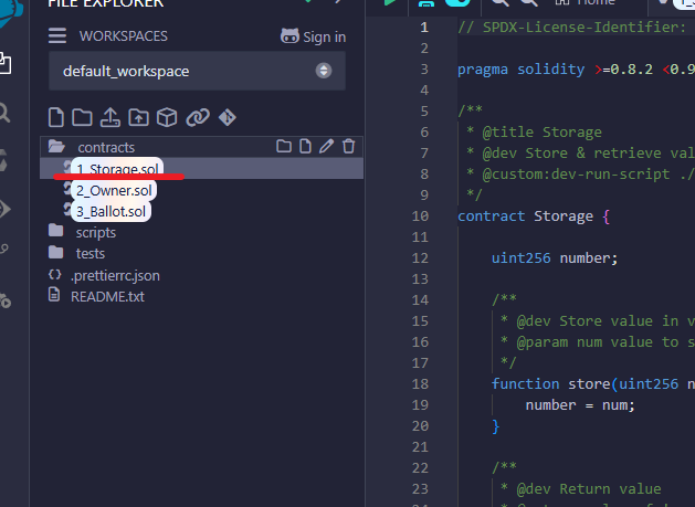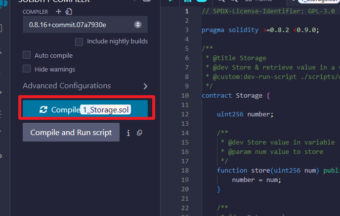 Solidity compliler - 상단 compiler에서 0.8.16+commit.07a7930e 로 설정 - Compile 1_Storage.sol 클