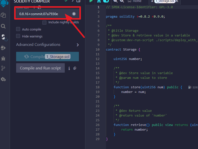 Solidity compliler - 상단 compiler에서 0.8.16+commit.07a7930e 로 설정 - Compile 1_Storage.sol 클