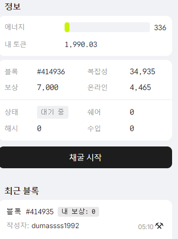 ☞ 자동 채굴이 시작되며 채굴하는데 에너지가 소모됨.