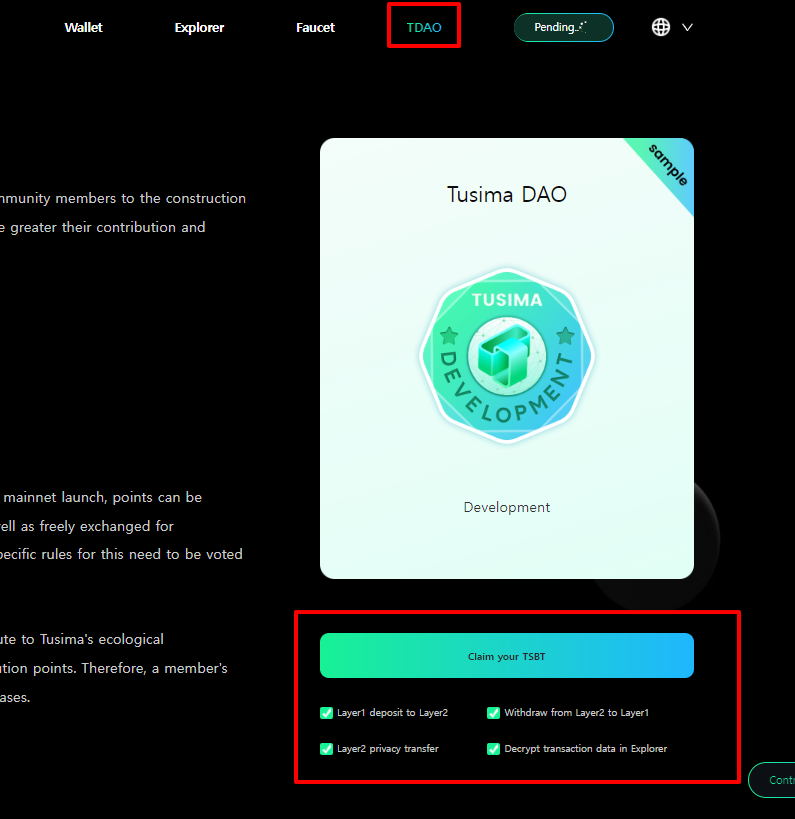 화면 상단의 TDAO 클릭 -> 아래의 미션이 모두 완료되었다면 클레임 TSBT 클릭!!