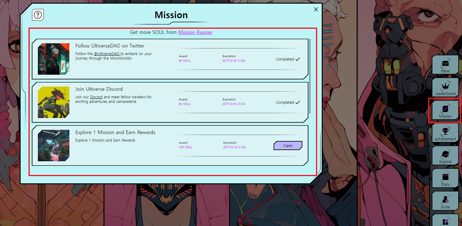 - 오른쪽 Mission을 클릭! 미션들을 완료해서 Soul 획득!