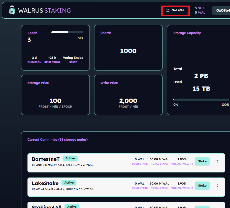 : 지갑 연결 - 상단의 'Get Wal' 클릭 - 수이를 Wal 토큰으로 교환 - 하단의 노드 중에서 하나를 선택해 wal 스테이킹