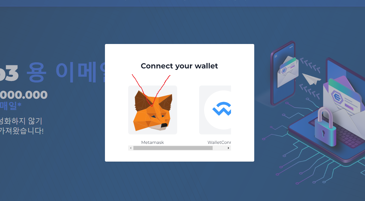 위의 첫 화면에서 무료 가입 클릭! 그럼 메타마스크 및 여러 지갑 연결 화면이 뜹니다. 저는 가장 일반적인 메타마스크로 진행해 보겠습니다.