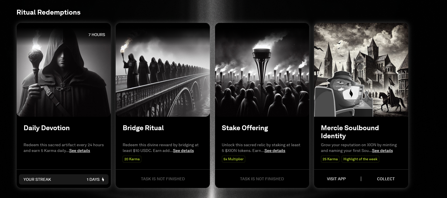 : 최소 $10 USDC를 브릿지해야함. 자이온 지갑내에 소유하고 있는 USDC와 XION 토큰 양에 따라 추가 카르마 획득.