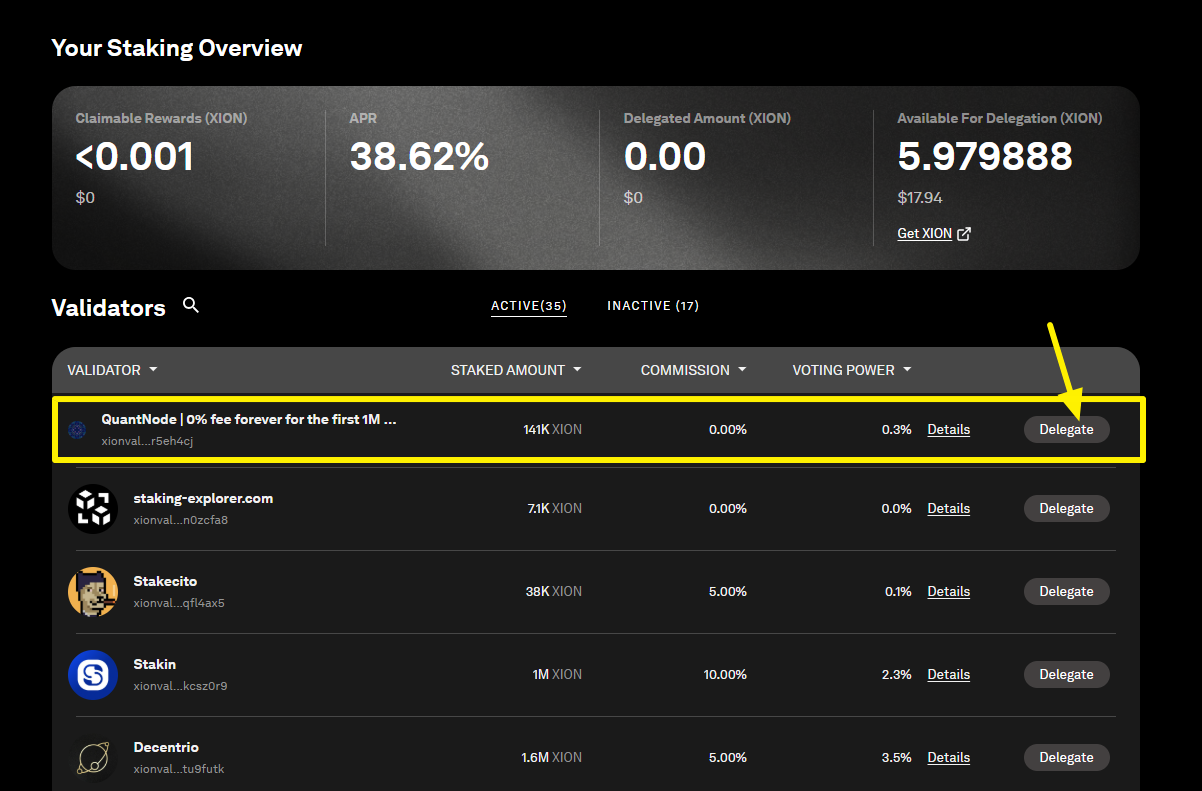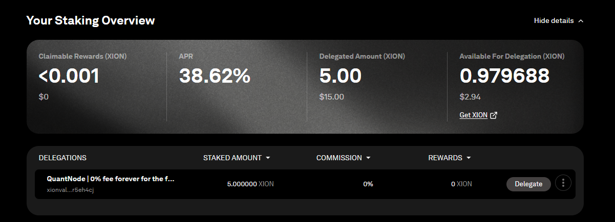 : 최소 5개의 $XION토큰을 스테이킹 하면 된다. 이 역시 스테이킹 수량에 따라 추가 카르마가 제공됩니다.