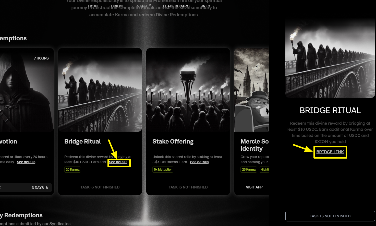 Bridge Ritual 아래 See details를 클릭하면 아래와 같은 브릿지 미션에 대한 설명카드가 나옴. 'BRIDGE LINK' 클릭