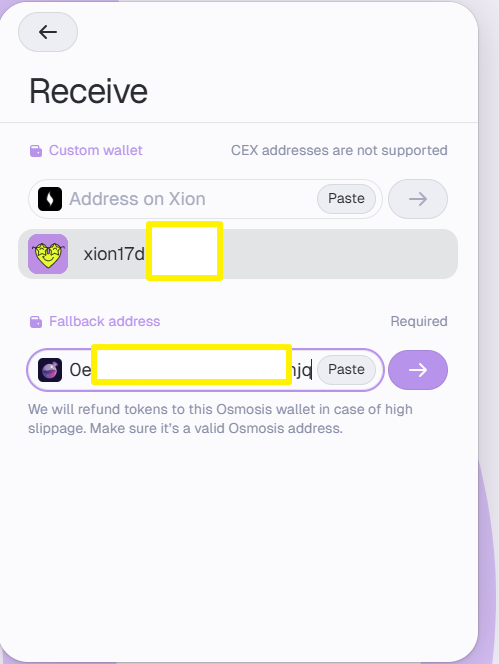 -> 그럼 자이온 주소와 Fallback 주소(케플러 지갑의 오아시스 지갑주소)를 입력해 줍니다.