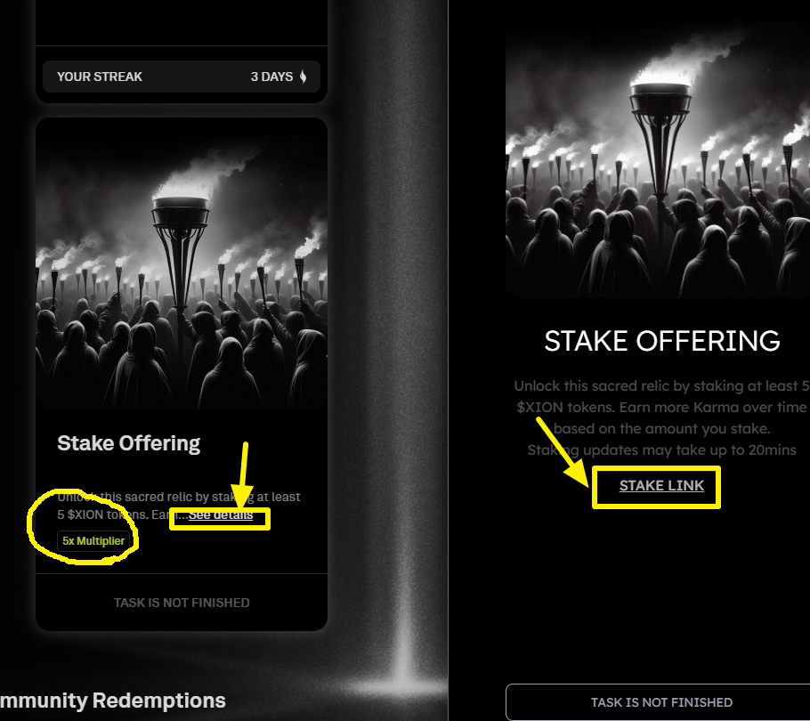 : 최소 5개의 $XION토큰을 스테이킹 하면 된다.  이 역시 스테이킹 수량에 따라 추가 카르마가 제공됩니다.