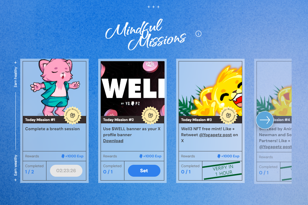이번에 소개해 드릴 프로젝트는 매일 명상을 포인트로 모을 수 있는 웰빙 프로젝트 well3의 요가펫 프로젝트 입니다. 매일 두번의 명상을 진행하고(아주 짧음) 기본적인 트위터 미션들을 완수하셔서 젬을 모아보시기 바랍니다. 향후 $WELL 토큰을 발행할 예정이라고 하니 참여해 보시기 바랍니다.